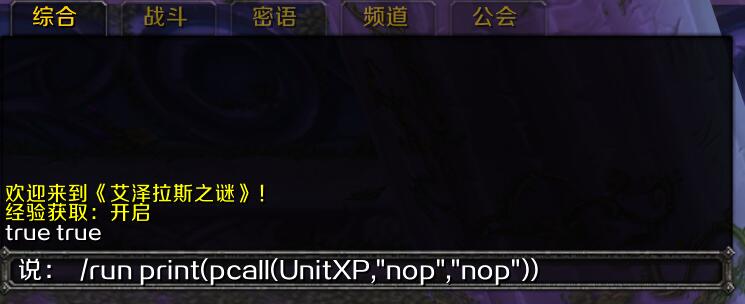 想要知道是否安装正确,加载成功,在游戏框中输入 /run print(pcall(UnitXP,"nop","nop")),在第一个窗口显示 true true 则加载成功。